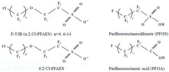 - Shi, Y.L.; Vestergren, R.; Xu, L.; Zhou, Z.; Li, C.X.; Liang, Y.; Cai, Y.Q. Human exposure and elimination kinetic of chlorinated polyfluoroalkyl ether sulfonic acids (Cl-PFESAs). Environ. Sci. Technol. 2016, 50, 2396–2404. [Google Scholar] [CrossRef]