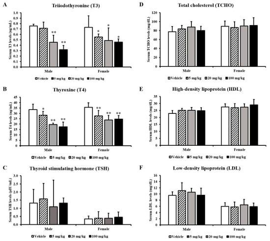APA StyleHong, S.-H., Lee, S. H., Yang, J.-Y., Lee, J. H., Jung, K. K., Seok, J. H., Kim, S.-H., Nam, K. T., Jeong, J., Lee, J. K., & Oh, J.-H. (2020). Orally Administered 6:2 Chlorinated Polyfluorinated Ether Sulfonate (F-53B) Causes Thyroid Dysfunction in Rats. Toxics, 8(3), 54. https://doi.org/10.3390/toxics8030054