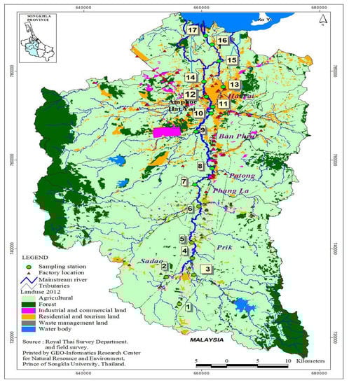 To assess the extent of phthalate acid ester contamination and potential risk in the aquatic ecosystem, a cross-sectional study was conducted in the U-Tapao canal in Songkhla Province, southern Thailand. The canal is one of the primary freshwater sources in southern Thailand. The U-Tapao canal is 68 km long and approximately 3 to 8 m deep with a flow rate that ranges < 6 in the dry season and ≥ 90 m3 in the wet period. The tropical monsoon climate of the canal is majorly influenced by the northeast and southwest monsoon with average rainfall ranging from 1600 to 2400 mm annually. The northeast monsoon causes heavy rainfall in the area from mid of October to mid-February. The temperature within and around the riverine ecosystem varies between 24 and 32 °C throughout the year. Land use pattern in the areas indicates that 75%, 15%, and 10% of the areas are covered by agricultural land, forest land, and urbanized areas, respectively.