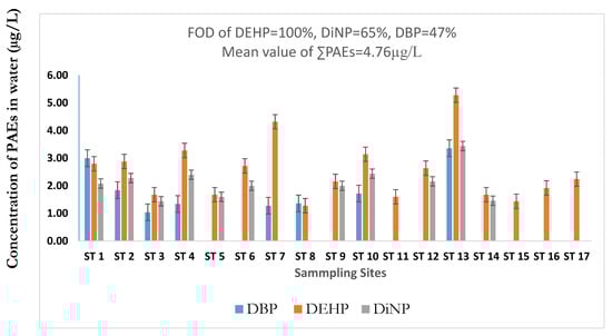 As indicated in Figure 2, the distribution of PAEs in the canal shows that the total PAEs were recorded at the highest levels at sampling site (ST) 13 (12.08 µg/L dw), besides, among the individual PAEs, the highest concentration of DEHP, DiNP, and DBP were quantified up to 5.28, 3.44, 3.36 µg/L in site 13, respectively. This site (ST 13) is located at Hat Yai city, the most significant industrial and commercial city in southern Thailand. In addition, higher concentrations of PAEs were measured at ST 1, 2, 4, 7, and 10, located at Sadao, Prik, and Phang La cities. Most of these sampling sites are located near industrial and commercial areas. Thus, high levels of PAEs may be due to extensive industrial and commercial activities around these sampling sites. Industrial effluents and domestic wastewater generated in these areas are discharged into the canal at many points sources [16,17,18]. In case of low concentrations at sites 15, 16, and 17, since these sites are located in rural areas, industrial and domestic wastewaters are not expected to contribute significantly. However, effluents from agriculture and aquaculture activities and atmospheric depositions may be the potential sources of PAEs contamination in these locations. This is in agreement with previous observations [3,7]. Overall, PAEs levels found in urban areas were higher than the levels measured in rural areas, confirming the observation of previous studies that reported that urbanization influences the level of PAEs’ contamination of aquatic environments [6,8,15].