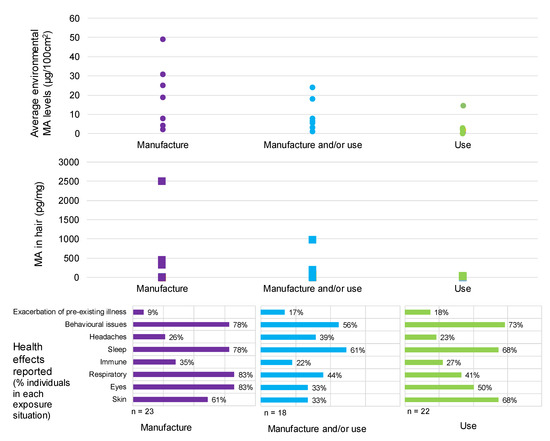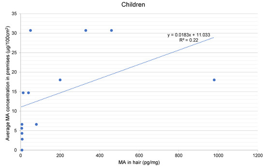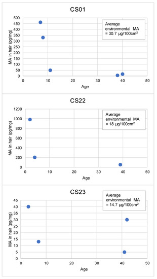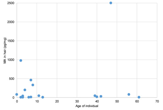 The hair analysis data showed higher levels of exposure occurring in younger children, which is consistent with the expectation that younger children will have higher levels of exposures due to more common floor play, poorer washing of hands, and mouthing of hands and objects [8,31]. In addition, young children have more porous hair than adults, which would make the hair more susceptible to environmental contamination [32,33].