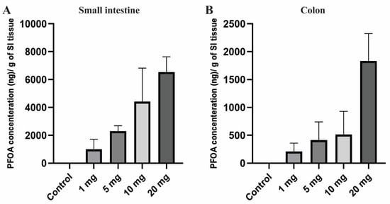 PFOA, the persistent perfluoroalkyl substance, has a high potential to accumulate in human and animal bodies and shows a large variation in concentration across the different tissues [65]. Extended half-life and high bio-accumulative characteristics increased its toxicity in living organisms [17]. After 10 days of PFOA exposure, small intestine and colon tissues of the female CD1 mice were noted to have a significant amount of PFOA accumulation compared to the control group in which no PFOA was detected. Accumulation of PFOA gradually increased in the tissue with an increase in dosing concentrations (Figure 1). The mean concentration of PFOA detected was 1002.62, 2298.06, 4427.71, and 6533.69 ng/g in the small intestine and 211.12, 412.73, 513.45, and 1834.27 ng in colon tissue for the treatment groups 1, 5, 10, and 20 mg/kg/day, respectively.