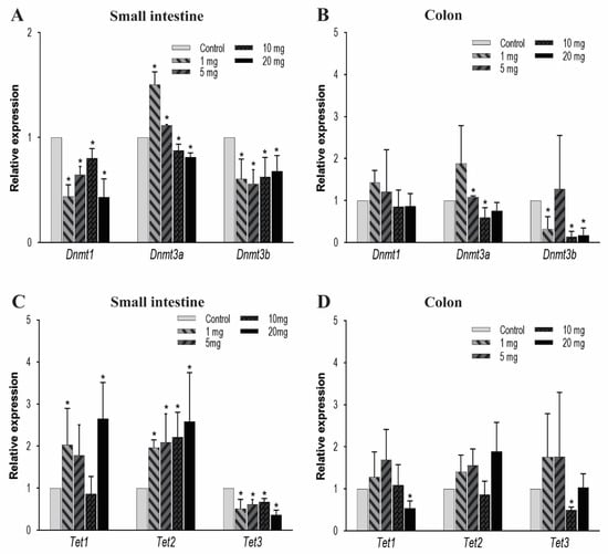 Effect of PFOA on the expression levels of DNA methylation (Dnmts) and DNA demethylating genes (Tets) in intestinal tissues of CD1 mice. Mice were treated with control (0.5% Tween-20 in water) or 1–20 mg/kg/day PFOA for 10 days. (A) Change in the mRNA expression level of Dnmt1, Dnmt3a and Dnmt3b genes in the small intestine; (B) change in the mRNA expression level of Dnmt1, Dnmt3a and Dnmt3b genes in the colon; (C) change in the mRNA expression level of Tet1, Tet2 and Tet3 genes in the small intestine; (D) change in the mRNA expression level of Tet1, Tet2 and Tet3 genes in the colon. Statistical values were considered significant at p-value ≤ 0.05 (denoted by “*”) and less significant at p-value > 0.05.