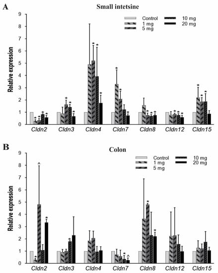 Effect of PFOA on the expression levels of tight junction gene Cldn in intestinal tissues of CD1 mice. Mice were treated with control (0.5% Tween-20 in water) or 1–20 mg/kg/day PFOA for 10 days. (A) Change in the mRNA expression level of Cldn2, Cldn3, Cldn4, Cldn7, Cldn8, Cldn12, and Cldn15 genes in the small intestine; (B) change in the mRNA expression level of Cldn2, Cldn3, Cldn4, Cldn7, Cldn8, Cldn12, and Cldn15 genes in the colon. Statistical values were considered significant at p-value ≤ 0.05 (denoted by “*”) and less significant at p-value > 0.05 but < 0.1 (denoted by “^”) reported from two-tailed tests.