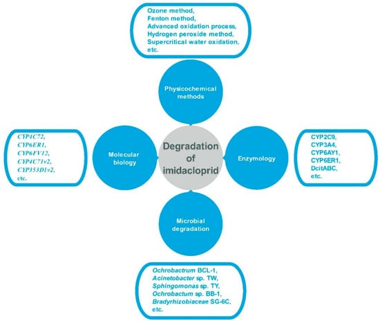 | 19. | Irradiation | UV | The degradation rate of imidacloprid (0.0255 mg·mL−1) is 98.43% after ultraviolet irradiation for 10 min | [77] |