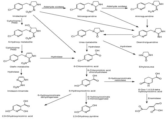 - Pang, S.; Lin, Z.; Zhang, W.; Mishra, S.; Bhatt, P.; Chen, S. Insights into the Microbial Degradation and Biochemical Mechanisms of Neonicotinoids. Front. Microbiol. 2020, 11, 868. [Google Scholar] [CrossRef]