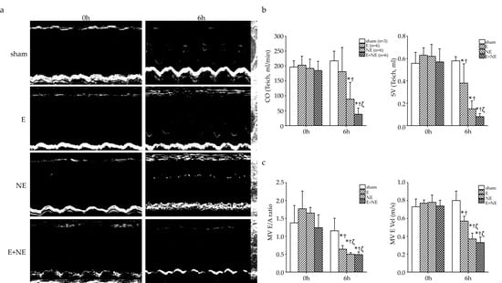 According to echocardiography results, CO, stroke volume (SV), and EF could be calculated for systolic function (Figure 2b), while peak early diastolic mitral valve velocity (MV E Vel) and peak early/late diastolic mitral valve velocity could be presented as diastolic function (Figure 2c). We found that the NE group showed significantly reduced CO and SV compared to the sham group (p < 0.05). The E group showed only decreased SV compared to the sham group (p < 0.05) but the two groups were not different for CO. The combination of E and NE impaired systolic function, including SV and CO, more significantly than the E group (p < 0.05, Figure 2b). For diastolic function, a significant reduction in peak early/late diastolic mitral valve velocity and MV E Vel were found in the E, NE, and E+NE groups compared to the sham group at 6 h (p < 0.05). Lower MV E Vel was observed in the NE and E+NE groups than in the E group (Figure 2c). Additionally, we observed that interventricular septum thickness, left ventricular posterior wall thickness, and the total left ventricular mass, significantly increased in the NE and E+NE groups when compared to the sham group (Table S1).