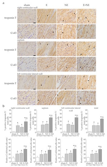 Cardiac troponin release has been measured to diagnose different types of acute cardiac injuries while the lateralization of Cx43 can be observed in many pathological heart diseases [,,]. Immunohistochemical staining was performed to detect troponin T and Cx43 in cardiac tissue after 6 h infusion of catecholamine (Figure 3a,b). Our results showed that the expression of troponin T and Cx43 was significantly increased in the E and NE groups and the E+NE group showed greater changes in the RV, septum, and LV lateral walls compared to the sham group. In these three parts, lateralization of Cx43 was also raised in the NE and E+NE groups and the damage appeared in whole ventricular cardiac muscles rather than specific regions (Figure 3a).