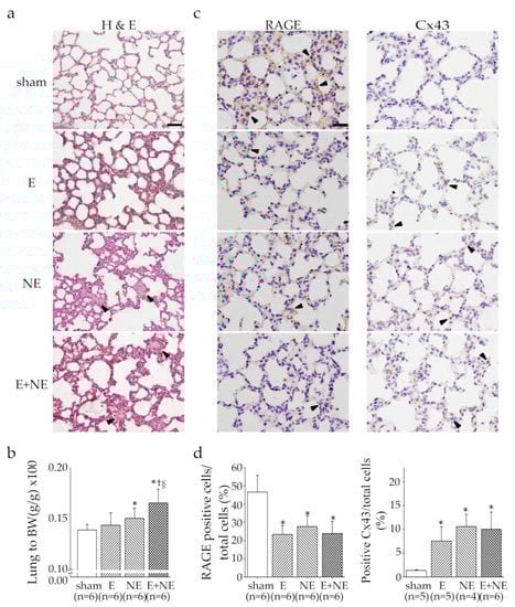 The acute lung injuries induced by catecholamine overdose. (a) Representative hematoxylin-and-eosin (H and E) staining of lung sections after 6 h continuous catecholamine injection and (b) the ratio of lung to body weight was showed. (c) Representative immunohistochemical staining with RAGE and connexin43 antibody (arrowhead) in lung sections of sham, E, NE and E+NE groups. (d) Quantitative analysis of RAGE and connexin43 in lung tissues. Data are expressed as means ± SD. RAGE, the receptor for advanced glycation end products; Cx43, connexin43; sham, 0.9% saline; E, epinephrine; NE, norepinephrine; E+NE, epinephrine and norepinephrine. Scale bar = 50 μm. * p < 0.05 vs. sham group, † p < vs. E group, § p < 0.05 vs. NE group.