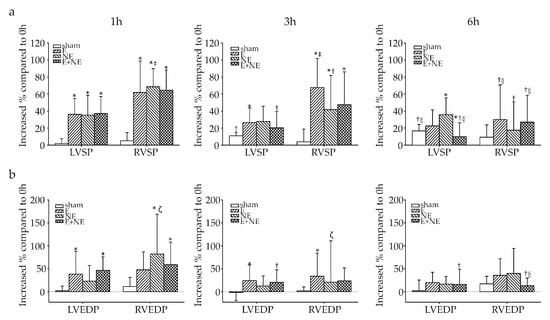 For increased percentage change of ventricular pressure (Figure 5a,b), after 1 h of continuous catecholamine infusion, we found that the systolic and diastolic pressure change is greater in the RV (increased 5.1% and 23% in the sham group, 61.8% and 95.8% in the E group, 68.5% and 164.6% in the NE group, and 64.6% and 118.6% in the E+NE group) than in the LV (increased 1.8% and 4.3% in the sham group, 36.1% and 77.2% in the E group, 35.3% and 46.3% in the NE group, and 37.0% and 93.5% in the E+NE group) under high plasma levels of E and/or NE.