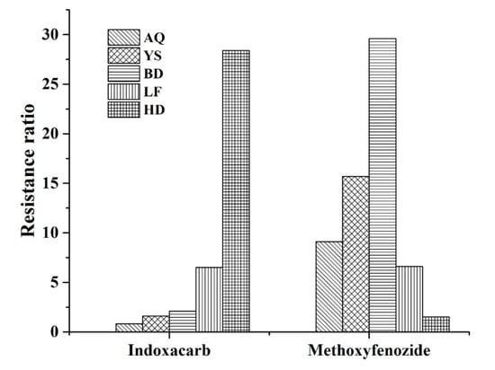 Resistance ratios of H. armigera field populations to indoxacarb and methoxyfenozide. AQ, Anqiu population; YS, Yishui population; BD, Baoding population; LF, Langfang population; HD, Handan population.