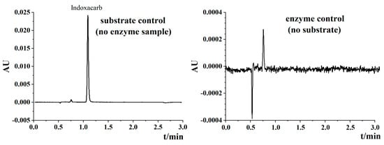 Chromatographs of enzyme control (no substrate) and substrate control (no enzyme sample). Enzyme solution and indoxacarb were needed in the indoxacarb N-Decarbomethoxylation reaction. The chromatographs showed that there was no interfering peak or ghost peak in the enzyme solution control and substrate control.