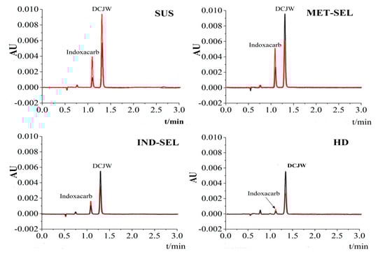 HPLC chromatograms of indoxacarb and DCJW in four populations of H. armigera from time-course experiments (UV, 314 nm) []. Injection volume was 2 μL; indoxacarb and DCJW peaks were integrated. Red line, chromatographic trace for 1 h reactions; black line, chromatogram for reactions that were incubated for 2 h. SUS, susceptible population; MET-SEL, methoxyfenozide-selected population; IND-SEL, indoxacarb-selected population; HD, Handan population.
