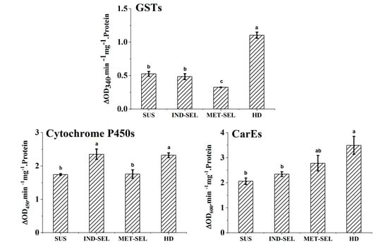 Activities of detoxification enzymes in the midgut of sixth-instar larvae of four populations of H. armigera. GST, glutathione S-transferase; Cytochrome P450s, cytochrome P450s mono-oxygenase; CarE, Carboxyl esterase; SUS, susceptible population; MET-SEL, methoxyfenozide-selected population; IND-SEL, indoxacarb-selected population; HD, Handan population. Results are means ± standard error (SE) of three separate replicates. Data marked with different letters were significantly different (p < 0.05).