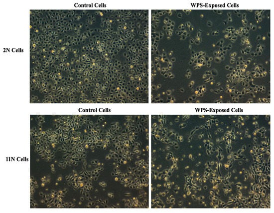 In order to study the effect of WPS on human HN carcinogenesis, we examined the outcome of WPS on two human normal oral epithelial, 2N and 11N, which were established in our lab []. Our data revealed that treatment of 2N and 11N cell line with 100 μg/mL of WPS solution for 2 days slightly deregulates cell proliferation and cell cycle progression of both cell lines in comparison with untreated cells (data not shown). On the other hand, we found that WPS exposure induces EMT, where both cell lines display a more mesenchymal phenotype in comparison with their matched unexposed controls (Figure 1). The cells become more elongated in appearance and show a decrease in cell–cell contact compared with untreated ones (Figure 1).