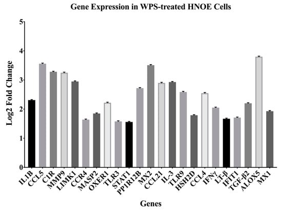 Next, gene expression was applied on both cell lines, using the NanoString PanCancer Pathway Panel consisting of probes for 770 genes implicated in carcinogenic pathways; our data showed that out of these genes, 23 were found to be differentially expressed in WPS-exposed versus unexposed 2N and 11N cells: CCL5, C1R, MMP9, IL-1B, CCL4, MASP2, OXER1, TLR3, STAT1, PPP1R12B, MX1, MX2, CCL21, IL-3, TLR9, HSH2D, CCR4, IFNγ, LT-β, IFIT1, TGF-β2, ALOX5, and LIMK1 (p < 0.05).
