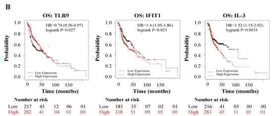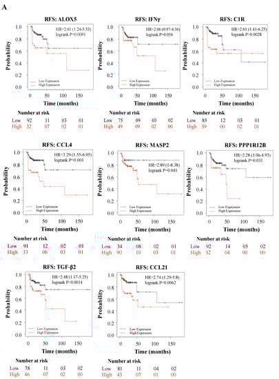 Interestingly, while high expression of ALOX5 (p = 0.0091), IFNγ (p = 0.054), C1R (p = 0.0028), CCL4 (p = 0.001), MASP2 (p = 0.041), PPP1R12B (p = 0.031), TGF-β2 (p = 0.014), and CCL21 (p = 0.0062) correlates positively with poor RFS (Figure 3A), expression of TLR9 (p = 0.027), IFIT1 (p = 0.021) and IL-3 (p = 0.0031) correlates positively with poor OS (Figure 3B).