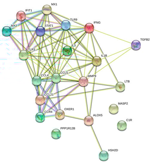Following the identification of candidate genes, we validated our panel using qRT-PCR analysis. The set of genes differentially expressed corresponded with the NanoString analysis with twenty-three (IL-IB, CCL5, C1R, MMP9, LIMK1, CCR4, MASP2, OXER1, TLR3, STAT1, PPP1R12B, MX2, CCL21, IL-3, TLR9, HSH2D, CCL4, IFNγ, LT-β, IFIT1, TGF-β2, ALOX5 and MX1) upregulated genes by a factor ranging from 1.58 to 3.8 folds (p < 0.05) (Figure 2).