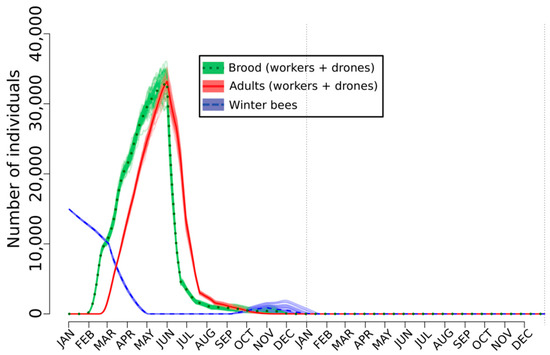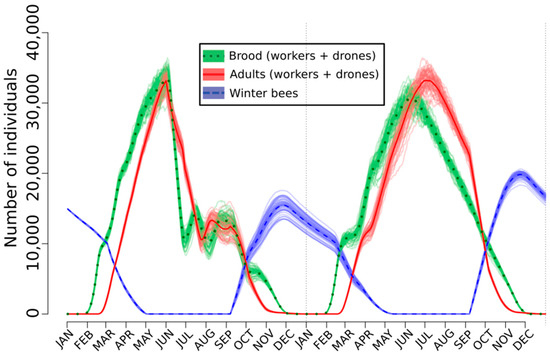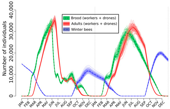 A large collection of sublethal effects have been measured on the larvae and the adult bees but it is not obvious to translate these individual-level effects often measured under specific conditions within the laboratory into population-level effects that are more ecologically relevant. Modeling can be helpful to reach this goal. Among the different available paradigms, the agent-based models are the most interesting. Indeed, these bottom-up stochastic computational devices allow us to simulate spatio-temporal actions and interactions of real-word entities, called agents, in order to extract their combined effects on the system as a whole [121,138,139,140,141]. In this context, an agent-based model called SimBeePop (version 1.04) was designed for predicting the various effects of the organic molecules on all the hive inhabitants (i.e., agents). The model runs from 113 parameters that define the structure and the properties of the agents and the environment. In addition, 27 parameters allow us to characterize the type, intensity, and duration of the perturbations that can be applied to individuals (e.g., nurses), groups (e.g., larval stages) or to the whole population. These perturbations can be applied punctually (e.g., one day), during a given period (e.g., weeks) or can be made during the whole simulation time. The number and characteristics of the perturbations depend on the scenario that is simulated. The characteristics of SimBeePop are described in-depth by Devillers et al. [121]. Briefly, without the application of perturbations, the model simulates the normal population dynamics of a complete honey bee colony in a Dadant hive during a two-year period or more. To our knowledge, SimBeePop is the sole model accounting for the summer and winter bee populations with all their own characteristics as well as the main factors influencing the egg-laying rate of the queen during her life. All the different categories of bees are accounted for including the eggs and the successive larval stages. In the same way, all the important events such as the polyethism and cannibalism are encoded. As a result, SimBeePop is particularly suited for modeling the multifaceted effects of endocrine disrupting chemicals. The stochasticity accounted for by the model requires repeating the simulations with the same set of parameters (e.g., n = 50). The outputs are graphically displayed as collections of curves (i.e., one per simulation and the mean of all simulations) differently colored for the key bee categories.
