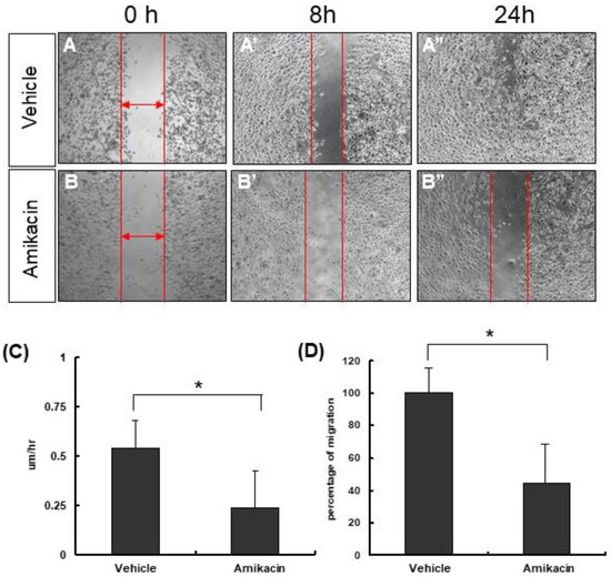 Figure 1. Effects of amikacin on cell migration. (A,A’,A’’) MDA-MB-231 cells were treated with PBS (vehicle) or (B,B’,B’’) amikacin for 0, 8 and 24 h. (C) Cell migration rates (μm/h) of both the vehicle- and amikacin-treated groups. (D) Percentages of cell migrations for both vehicle- and amikacin-treated groups. Values are means of three independent experiments (N = 3), with standard deviations represented by vertical bars. Migration rates and percentage of migration from three independent experiments were measured and statistically analyzed. (Averages ± SD; * p < 0.05).