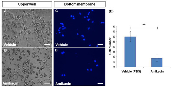 Figure 2. Effects of amikacin on cell invasion. Trans-well analysis of both vehicle- (A,C) and amikacin-treated (B,D) MDA-MB-231 cells. Photos were taken from the upper wells (bright field, A,B) or from the bottom (stained with DAPI, dark field, C,D). (E) Number of invasion cells of both vehicle- and amikacin-treated groups. Values are the means of three independent experiments (for additional pictures, see Supplemental Materials Figure S2), with standard deviations represented by vertical bars. Number of invasion cells from three independent experiments were measured and statistically analyzed. (Averages ± SD; ** p < 0.01). Scale bar: 25 μm.
