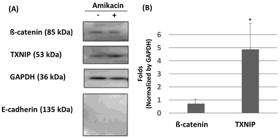 Figure 3. Effects of amikacin on MDA-MB-231 cell protein expressions. (A) Western blotting showing the expression of ß-catenin, TXNIP, GAPDH and E-cadherin in MDA-MB-231 cells treated with or without amikacin for 24 h. (B) Western blotting signals were quantified by using the “1D gel analysis” function of the commercial software ImageQuant TL. Data were collected from three independent experiments, normalized by the expressions of GAPDH, and statistically analyzed. (Averages ± SD; * p < 0.05).
