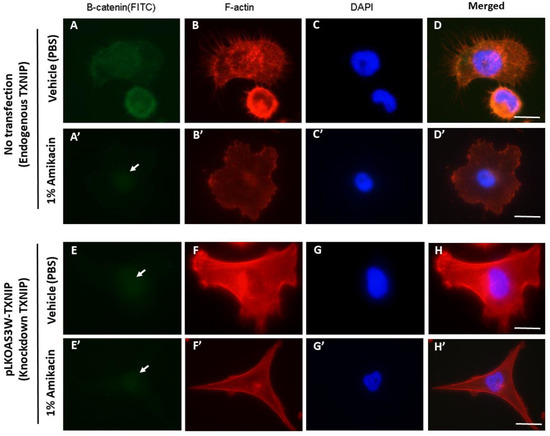 Finally, we used an siRNA knockdown approach to decrease endogenous TXNIP expressions in MDA-MB-231 cells, followed by an antibody staining experiment (counterstained with DAPI to make the nucleus visible), and tried to uncover the relationships among amikacin, ß-catenin and TXNIP during cell migration and the invasion process. Results showed that endogenous ß-catenin and TXNIP expressed and distributed evenly throughout the whole cell (Figure 4A–C). In contrast, in the amikacin-treated group, endogenous ß-catenin expressions were nearly undetectable in the cytoplasm, with only very faint signals observed in the nucleus (Figure 4A’, arrow indicates). F-actin staining showed that amikacin treatment led to less filament actin polymerization and distribution at the edges of cells (Figure 4B,B’).