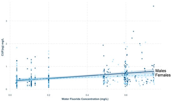 Daily dietary fluoride intake was not associated with CUFSG in PROGRESS (B = −0.01, 95%, CI: −0.06, 0.05, p = 0.82). In MIREC, water fluoride concentration was significantly associated with CUFSG, after adjustment for age and sex (B = 0.44, 95%, CI: 0.30, 0.59, p < 0.001); this association significantly interacted with sex (p = 0.07), but not age (p = 0.20). Specifically, water fluoride levels tended to be more strongly associated with CUFSG levels for males (B = 0.57, 95% CI: 0.37, 0.77), as compared to females (B = 0.31, 95% CI: 0.10, 0.51; Figure 1).