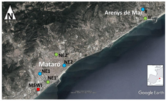Nine soil samples were obtained: three in the closest area (<25 m), two at nearby locations (<1.5 km, NE1 and NE1′), two at distant points (>3 km, NE2 and NE2′), and finally, two at Arenys de Mar (>10 km, B and B′). Five air samples were collected: two very close to the MSWI (<25 m), one in a nearby place (<1.5 km, NE1), one in a distant place (>3 km, NE2), and finally one in the town of Arenys de Mar (B). The location of the sampling points is depicted in Figure 1.
