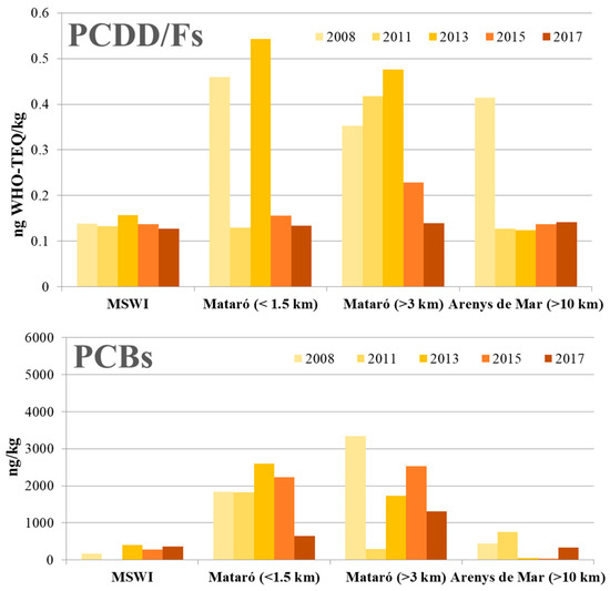 From 2008 onwards, the environmental impact of the MSWI of Mataró, in terms of human health risks, has been periodically assessed. This monitoring program has been performed in parallel to the biological surveillance survey, which is aimed at the evaluating the body burdens of PCDD/Fs and PCBs in the facility workers and the population living nearby the plant. According to the most recent study, performed in 2012, the concentrations of PCDD/Fs in whole blood were very similar in the different population groups: 13.2, 13.1, 13.8, and 13.1 pg WHO-TEQ/g fat in workers, exposed people (living at <1 km in Mataró), unexposed people (living at >3 km in Mataró) and inhabitants of Arenys de Mar. This profile is the same as that of PCDD/Fs in soil samples collected in 2015 and 2017, since PCDD/F levels were very similar in the different sampling sites. It must be highlighted that soil is an accumulative matrix; therefore, soils are suitable long-term environmental monitors [22]. Furthermore, since 1995, when the biological surveillance study was initiated, PCDD/Fs in whole blood has not increased with time. In both exposed and non-exposed groups, PCDD/Fs concentrations experienced a slight increase from 1995 to 1999, followed by a slight decrease from 1999 to 2002 and stabilization afterwards, with no relevant differences between them [13]. The results of the environmental monitoring program, which was started in 2008, indicates higher PCDD/F concentrations in soils in the first surveys, being notably reduced with time. Regarding PCBs, whole blood concentrations of the sum the congeners 138, 153 and 180 showed fluctuations according to the population group. The inhabitants of Arenys de Mar (background) presented the highest body burdens of PCBs (0.34 µg/g fat), while those living in Mataró (>3 km) and the facility workers showed the minimum values (0.15 and 0.16 µg/g fat, respectively). PCBs in soils also showed larger fluctuations than PCDD/Fs, although PCB soil levels in Arenys de Mar were found to be relatively low compared to those found in the city of Mataró.