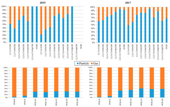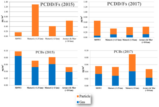 One of the novelties of the campaigns conducted in 2015 and 2017 is the specific study of gas/particle partitioning. Therefore, the concentrations of both, PCDD/Fs and PCBs, in the gas and particle phases were separately determined by analysing PUFs and microfiber filters, respectively. The contribution of the gas and the particulate fractions to the total amount of PCDD/Fs and PCBs is shown in Figure 5. In both campaigns, 2015 and 2017, PCDD/F congeners adsorbed to particles showed a higher contribution than PCDD/Fs in the gas phase, being especially evident in 2015. Contrastingly, a relatively higher contribution of PCBs congeners in the gas phase was noted, mainly in 2015. The three samples of air closer to the MSWI, including those collected in the city of Mataró, showed a slightly larger contribution of PCDD/Fs in the particle phase. However, the differences were minimal when comparing the pattern in the closest sites with that found in the background location. Regarding PCBs, higher contribution percentages of the gas phase were found in all the samples.