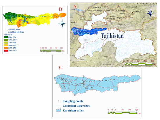 Figure 1. Investigated area location in the Tajikistan map (A); altitude (meter) of the investigated area, respectively by sampling points (B); soil and sediment sampling sites of Zarafshon Valley (C).