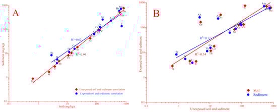 The average values of elements in unexposed soils and sediments, illustrated in (Figure 4A—red line) indicates that there was a good linear correlation between them, which can be better described by a Pearson’s correlation coefficient equal to 0.99 at p < 0.01. In the absence of normal distribution, the nonparametric Spearman correlation coefficient is the optimal approach for better interpretation of data. The relative similarity in terms of the content of investigated elements can evidence the practical identity of bottom sediments and soils. However, in the case of anthropogenically exposed soil and sediment (Figure 4A—blue line), the correlation coefficient equal to 0.62. It can be seen that the statistical relationship between the average values of exposed and unexposed soil and sediment are very different. This indicates great changes in the elemental balance in the anthropogenically exposed samples.