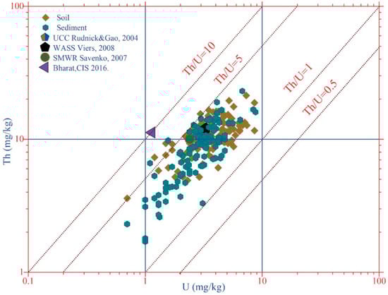 One of the important indicators of soil pollution is the ratio of thorium to uranium (Th/U). The Th/U ratio of 3–5 is observed in the overwhelming majority of soils in different regions, countries and continents, regardless of their types of origin [20,21]. The result of our study showed that the Th/U ratio in soils and in bottom sediments is predominantly at the regional level of 3.5–5 (Figure 5). In rare cases, the Th/U ratio in the studied soils varies from 1.3 (at Th/U = 11.6/8.6 mg/kg) to 6.2 (at Th/U = 9.3/1.5 mg/kg) and in bottom sediments from 1.1 (at Th/U = 3.3/3.1 mg/kg) to 6.2 (at Th/U = 9.8/1.6 mg/kg), respectively.