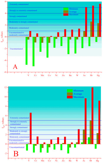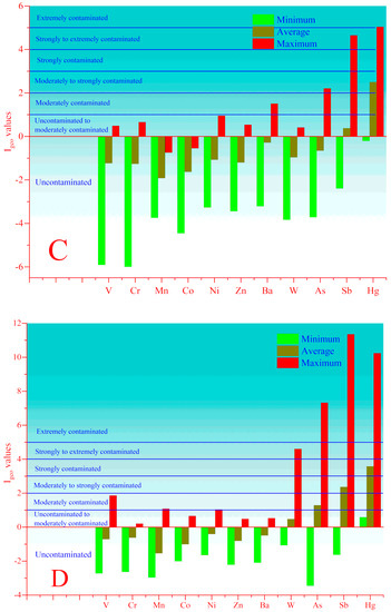 In the case of anthropogenically exposed soils (Figure 7B and Table S2), more intensive accumulation is observed for As, Sb and Hg, which average values indicate moderately to strongly contamination for Hg (class III), strongly contaminated for As and from strongly to extremely contamination (class V) for Sb. In addition, the maximum values of Igeo for V, As, Sb and Hg reach 6.6, 9.6, 12 and 9.1 and indicate extreme contamination (class VI). The maximum values of Igeo for Cr, Co, Ni and Zn indicate uncontaminated to moderately contaminated (class I) and for W strongly contaminated (class III).