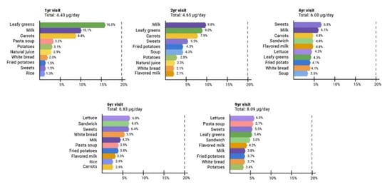 Figure 1 shows the primary foods contributing to the estimated dietary intake of Cd from 1 to 9 years of age. At 1 and 2 years, the top contributors were leafy greens (1 year: 16.0%, 2 years: 9.0%), milk (1 year: 10.1%, 2 years: 9.8%), and carrots (1 year: 8.8%, 2 years: 7.9%); at 4 years, the top contributors were sweets (6.8%), milk (6.1%), and carrots (4.8%); at 6 years, the top contributors were lettuce (6.8%), sandwich (6.6%), and sweets (6.4%); and at 9 years, the top contributors were lettuce (6.0%), pasta soup (5.7%), and sweets (5.5%). Total dietary Cd intake was 4.43 ± 2.53 µg/d at 1 year; 4.65 ± 2.45 µg/d at 2 years; 6.00 ± 3.45 µg/d at 4 years; 6.83 ± 3.15 µg/d at 6 years; and 8.09 ± 4.33 µg/d at 9 years. According to the TWI, Cd intakes were exceeded by children at all study visits (study visit, % children): 1 year, 64%; 2 years, 49%; 4 years, 35%; 6 years, 28%; and 9 years, 16%. For the cumulative Cd score (n = 175 children with information on dietary Cd in all study visits), we saw that 23 children had low Cd across all study visits; 38 children had high Cd in one study visit; 57 children had high Cd in two study visits; 31 children had high Cd in three study visits; 16 children had high Cd in four study visits; and 10 children had high Cd intake in all five study visits.