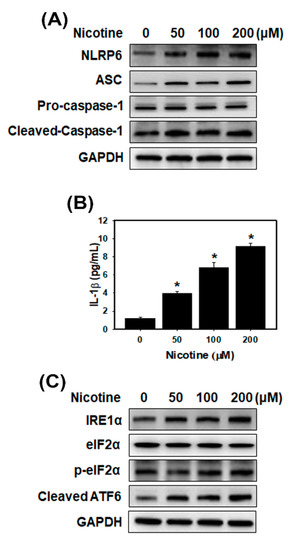 Recent evidence has shown that nicotine causes atherosclerosis via the ROS-NLRP3 inflammasome pathway in endothelial cells [17]. The most studied subunits of inflammasomes are NLRP3 and NLRP6. First, we assessed NLRP3 protein expression using Western blot analysis. However, there was no increase in NLRP3 expression in the HK-2 cells treated with nicotine (Figure S2A). Furthermore, we analyzed the NLRP6 inflammasome-related proteins and a cytokine (IL-1β) (Figure 2A,B and Figure S2B). The results indicated that NLRP6, ASC and cleaved-caspase 1 increased after nicotine treatment in HK-2 cells. Nicotine caused the production of mature IL-1β in a concentration-dependent manner. Therefore, nicotine could induce the NLRP6 inflammasome pathway in kidney cells. A previous study demonstrated that nicotine directly triggered the ER stress response in rat placental trophoblast giant cells and damaged placental function [29]. However, another recent study concluded that nicotine reduced ER stress and improved hepatic steatosis in male rats with diet-induced obesity [30]. Therefore, we evaluated the effects of nicotine on the expression of the ER stress-related proteins in HK-2 cells (Figure 2C and Figure S2C). After incubation of the HK-2 cells with nicotine for 24 h, the cells showed increases in the expression of the IRE1α, p-eIF2α and cleaved ATF6.