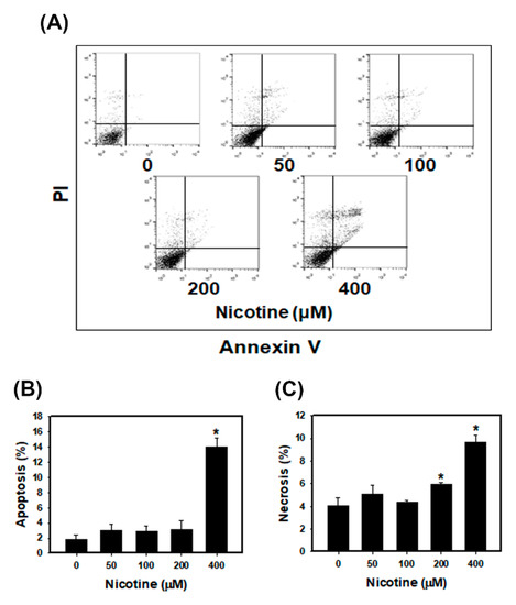The effects of nicotine on apoptosis and necrosis in HK-2 cells. (A) Apoptosis and necrosis were detected using an annexin V/PI staining assay. Quantification of apoptosis (B) and necrosis (C) in HK-2 cells. The HK-2 cells were treated with various concentrations of nicotine for 24 h. * p < 0.05 compared with the control. Data are presented as the means ± standard deviation of three independent experiments. Statistical significance was estimated with ANOVA by Dunnett’s multiple comparison test.