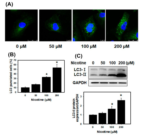 Measurement of autophagy in HK-2 cells that received nicotine treatments. (A) Confocal immunofluorescence microscopic imaging of LC3 following 24 h treatment with nicotine. (B) Quantification of punctate LC3 staining. * p < 0.05 compared with the control. (C) The protein levels of LC3 in the HK-2 cells treated with nicotine. The cells were treated with the various concentrations of nicotine for 24 h. The LC3-II protein expression of the histogram represents the average normalized densitometric values. GAPDH was used as the internal control. Data are presented as the means ± standard deviation of three independent experiments. * p < 0.05 compared with the control. Statistical significance was estimated with ANOVA by Dunnett’s multiple comparison test.