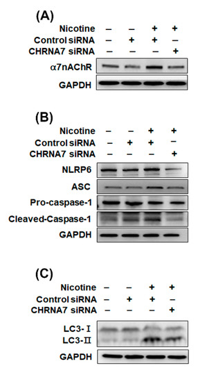 As shown in Figure 1C,D, nicotine increased α7nAChR expression in human kidney cells. However, it is currently unclear whether the inflammasomes are influenced by α7nAChR in kidney cells that are treated with nicotine. Recent evidence has shown that α7nAChR can inhibit the NLRP3 inflammasome by regulating β-arrestin-1 in a monocyte/microglia system, thus contributing to the control of neuroinflammation [33]. We analyzed whether α7nAChR could affect the NLRP6 inflammasome. We utilized α7nAChR siRNA to inhibit α7nAChR expression in HK-2 cells. As shown in Figure 5A and Figure S3A, following treatment with nicotine and control siRNA, the α7nAChR expression in HK-2 cells was increased. Transfection with α7nAChR siRNA inhibited the nicotine-induced increases in the α7nAChR protein level. Furthermore, α7nAChR siRNA suppressed the nicotine-induced NLRP6, ASC and cleaved-caspase 1 expression (Figure 5B and Figure S3B). A previous study found that a nonselective nAChR antagonist can reverse nicotine-induced autophagy in vascular smooth muscle cells [22]. However, few published studies have described the relationship between α7nAChR and autophagy. Therefore, we examined whether α7nAChR contributes to autophagy using α7nAChR siRNA. After transfection with α7nAChR siRNA and treatment with nicotine, the effect of nicotine on autophagy was inhibited in HK-2 cells compared with the control siRNA plus nicotine group (Figure 5C and Figure S3C). These results indicated that nicotine induced the NLRP6 inflammasome and autophagy via α7nAChR regulation.
