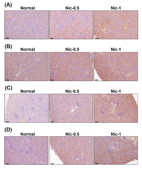 Eight-week-old male C57BL/6 mice (National Laboratory Animal Center, Taipei, Taiwan) were used. The animal protocol was reviewed and approved by the Institutional Animal Care and Use Committee of Taipei Medical University, Taiwan. The mice were randomly separated into three groups (five mice/group): (1) equivalent volumes of saline administered intraperitoneally (i.p.) three times per week for 4 weeks (normal group); (2) mice i.p. injected with 0.5 mg/kg nicotine three times per week for 4 weeks (Nic-0.5 group); and (3) mice i.p. injected with 1 mg/kg nicotine three times per week for 4 weeks (Nic-1 group). At the end of the experimental period, all animals were deeply anesthetized. Blood was collected from the heart, serum separated and stored at −80 °C. They were then killed and sacrificed. Then, the kidney tissues were fixed by formalin and paraffin embedded for histopathological and immunohistochemistry (IHC) staining.