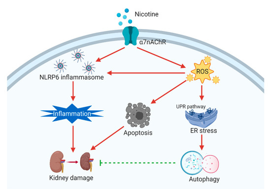 Nicotine causes α7nAChR, NLRP6 inflammasome, ER stress and autophagy in kidney cells. Nicotine induces the NLRP6 inflammasome via α7nAChR. Then, the NLRP6 inflammasome causes inflammation and induces kidney damage. Nicotine triggers autophagy through α7nAChR, and autophagy may protect against nicotine-induced kidney injury. Furthermore, nicotine increases ROS generation and accelerates ER stress by unfolded protein response (UPR) pathways. The high concentration of nicotine can induce apoptosis. Therefore, nicotine causes kidney damage through the modulation of α7nAChR, NLRP6 inflammasome, ER stress and autophagy. The figure was created with BioRender.com.