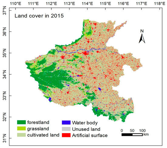 We divided land use types into six types based on the Land Use and Cover Change (LUCC) classification system: forestland, grassland, cultivated land, water area, artificial surface, and unused land. The land use data came from the Resource and Environmental Science and Data Center of the Chinese Academy of Sciences (http://www.resdc.cn/), with a spatial resolution of 1 km (Figure 1).