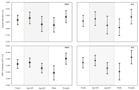 Negative associations between the abundance of residential green space and fasting blood glucose levels were identified, which is in agreement with results obtained in previous studies [20,37,38]. For the first time, we observed that the residential green space was associated with lower fasting blood glucose levels in men (%change, −2.060 in men vs. −0.972 in women) and the elderly (%change, −1.696 in elderly vs. −1.268 in young people). As relatively less research was conducted on blood glucose level associations, the results are mixed. Yang et al. and Danielle et al. reported results consistent with our findings that the men and the elderly benefited more from the protective effect of residential greenness than the general population [14,39]. However, few significant interactions were found between certain demographic characteristics and green space levels in two Asian studies [12,13].