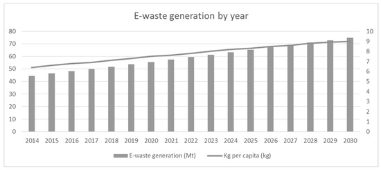 Globally, their diffusion is taking on extremely significant numbers. Reporting the data described in the monitor report produced by [11], globally, the total EEE consumption is increasing annually by 2.5 million metric tons (Mt), reaching an overall e-waste production of about 53.6 Mt, with a per capita value of about 7.3 kg. This trend is continuously growing, with a projection of doubling these quantities by 2030 in just 16 years, as reported in Figure 1.