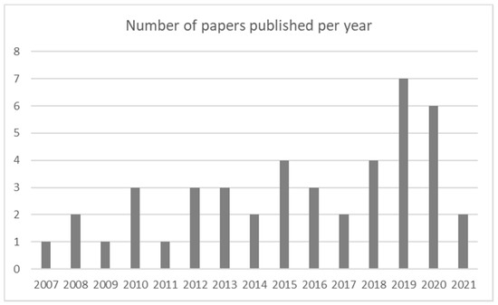 The selected articles describe research activities that were published during the period 2007–2021. Papers were collected for each year with at least one article, up to a maximum of seven articles per year. The years 2019 and 2020 are richer in terms of contributions than previous periods. Figure 4 reports their temporal distribution.