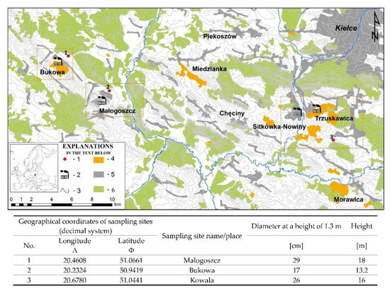 Scots pine Pinus sylvestris L. needles’ samples were collected in 2018 in Bukowa (limestone plant), Małogoszcz (cement plant), and Kowala (vicinity of the cement plant in Nowiny and the limestone plant in Trzuskawica) in an amount of approximately 200 g for each sampling site. The research sample consisted of mixed and averaged samples collected from about eight trees of the same age at each designated sampling site (Figure 1). The diameter of each tree was about 25 cm. The needles were taken from the whorl, on the top of tree, from the most exposed places possible.