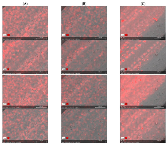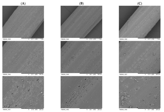 Scanning electron microscopy (SEM) microscopic images of pine needles; (A) Małogoszcz, (B) Bukowa, (C) Kowala.
