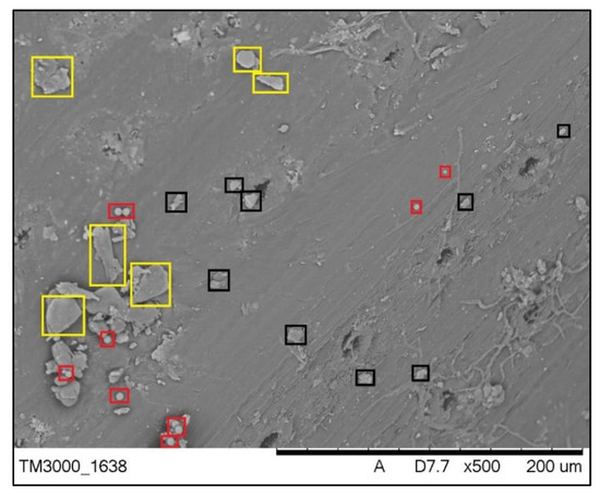 When interpreting the results of EDS analysis, the specificity of this analytical method should be taken into account. As a result of this analysis, graphic images are created in a parallel way with the SEM image of the sample’s surface. Information on the composition of the surface and the distribution of individual components are the result of measurements of the intensity and energy of X-rays, which is the effect of excitation of electrons of the electron cores of elements located on or near the surface of the material being tested. It should be remembered that the electrons used to create the SEM image (and when obtaining EDS data) penetrate the material to different depths depending on the type of matrix, but not more than for a few micrometers. This method is particularly suitable for imaging non-homogeneity in the distribution of elements on the surface of a given material; thus, it is a good tool for assessing the impact of dust on the surface of biological material. It also allows for indicating whether and how elements might migrate from pollutions and are absorbed by organic material. This analysis does not provide information on the elemental composition of deeper layers of material.