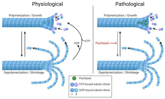 Paclitaxel enhances microtubule stability. Under physiological conditions, guanosine triphosphate (GTP)-bound tubulin dimers get incorporated at the growing end of the microtubules. This structure is supposed to form a stabilizing cap of GTP-bound tubulin. The conformation change in tubulin dimers is due to the GTP getting hydrolyzed into guanosine diphosphate (GDP), and this destabilizes the microtubule lattice. Through the loss of the GTP-tubulin cap, the microtubules are getting depolymerized. This process of microtubule depolymerization gets prevented by paclitaxel binding to β-tubulin (pathological condition). Created with BioRender.com (accessed on 20 September 2021).